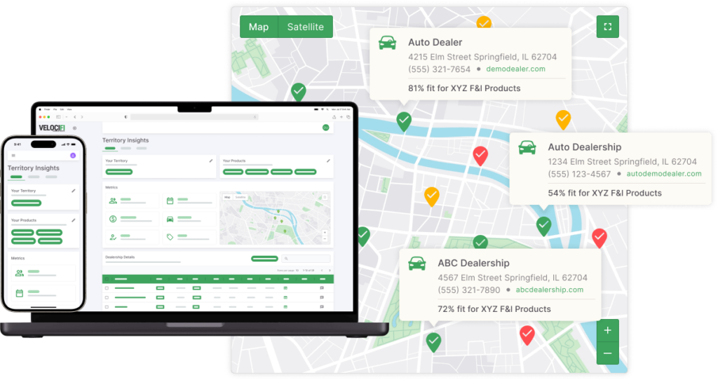 VelociFI helps F&I professionals identify and connect with the right dealerships using advanced territory and dealership data. With targeted insights and streamlined outreach tools, you can find high-potential opportunities and efficiently build lasting partnerships.